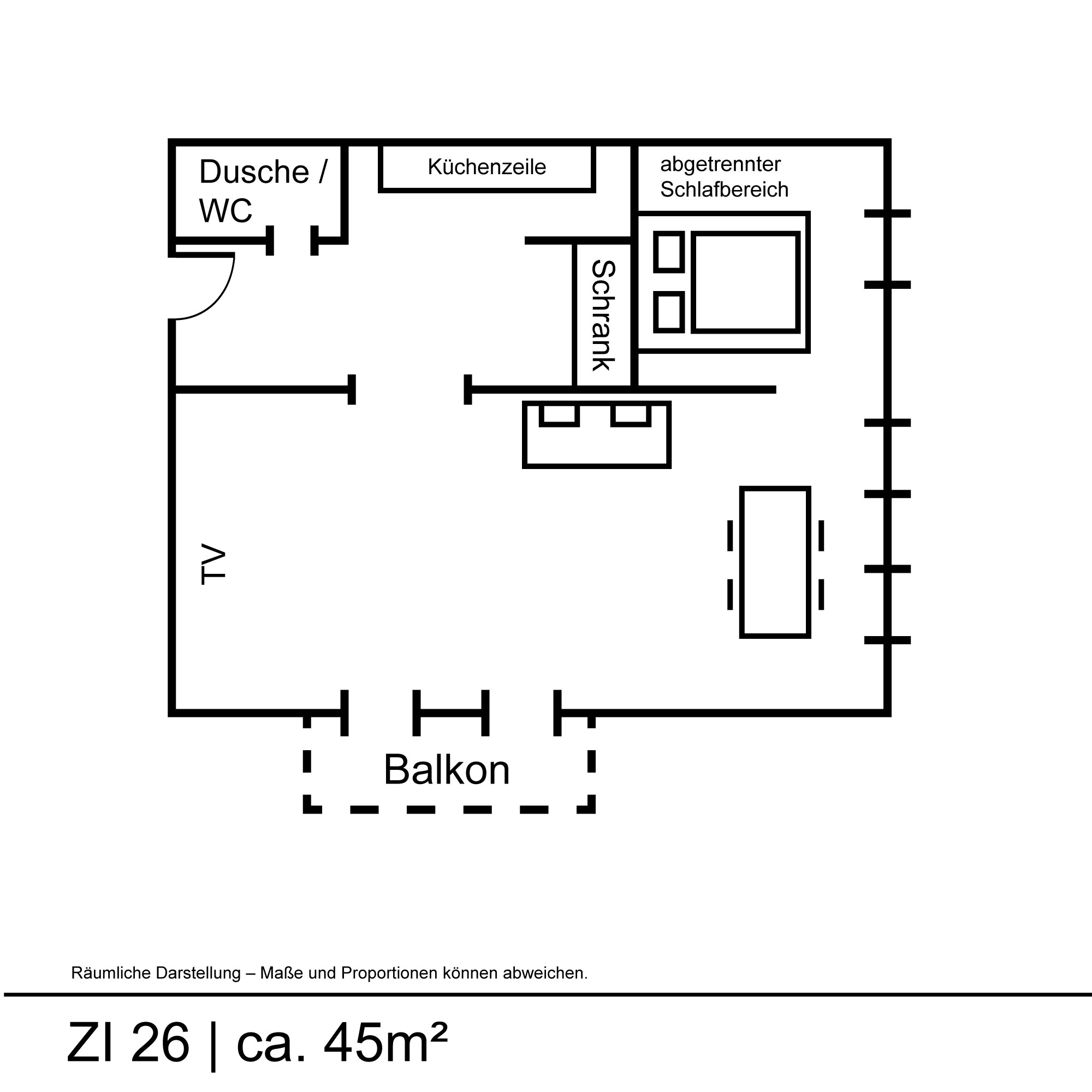 2,5 Zimmer, Wohnzimmer mit abgetrenntem Schlafbereich, Doppelbett, separates Schlafzimmer mit franz. Bett, 2x Dusche/WC, Balkon, Küche